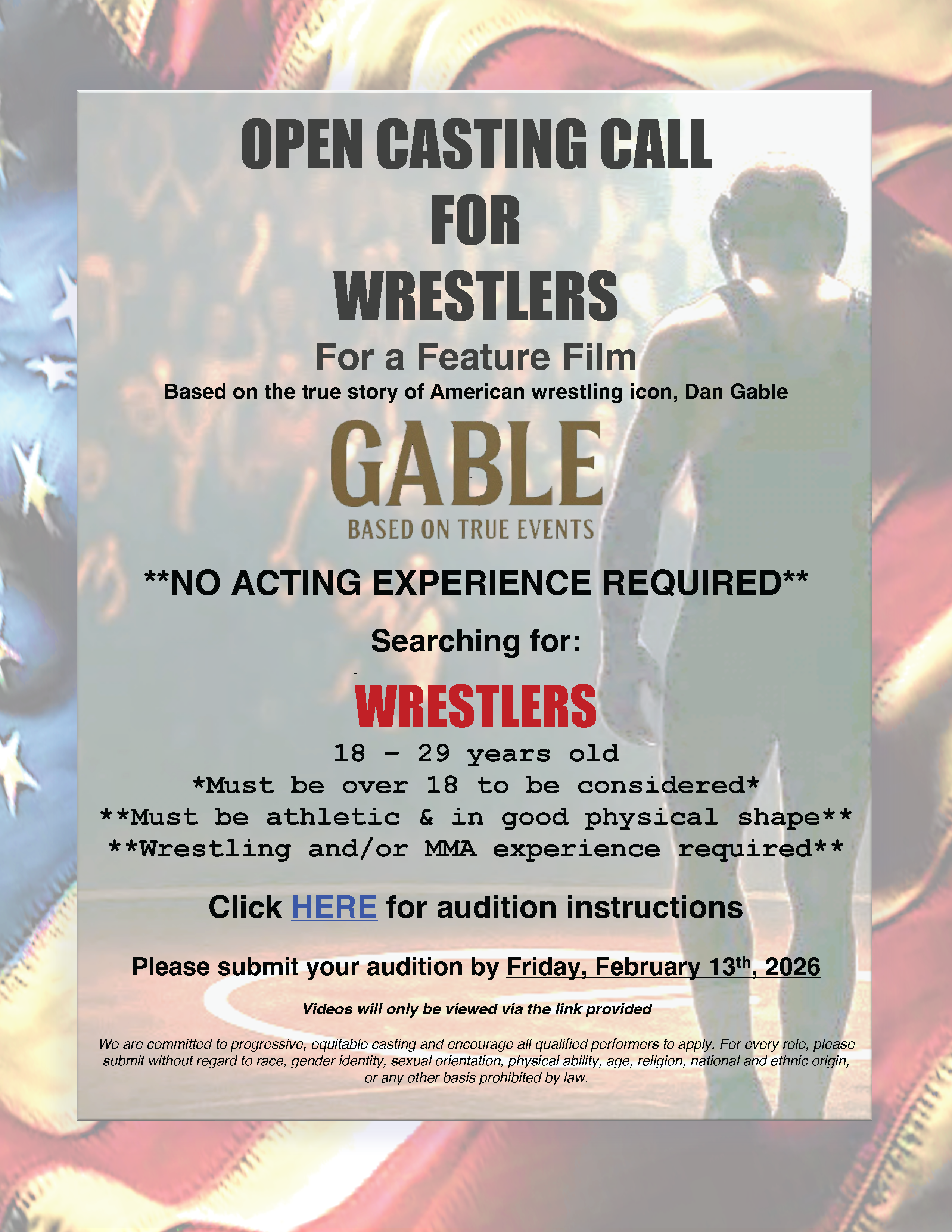 Calling all wrestlers. A major feature film based on the true story of American wrestling icon Dan Gable is now casting, and you could be part of it. The production is seeking male and female wrestlers ages 18–29 who are athletic, in good physical shape, and have wrestling or MMA experience. No acting experience is required. If you’ve ever dreamed of telling the story of wrestling on the big screen, this is your moment. How to audition Submit a video audition using the official casting link (videos will only be viewed through the provided link). Deadline All submissions must be received by Friday, February 13, 2026. This production is committed to inclusive and equitable casting and encourages all qualified performers to apply. |