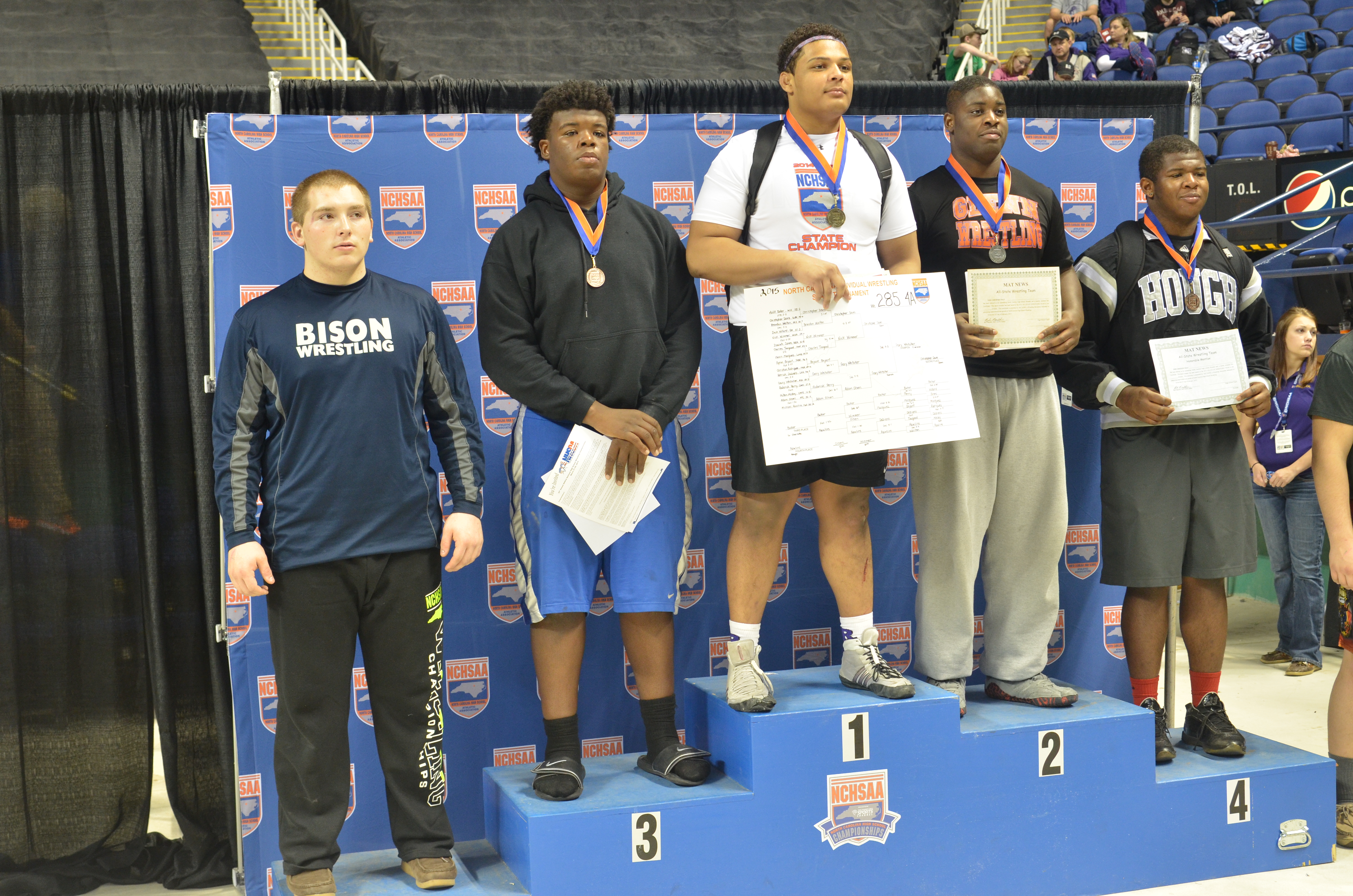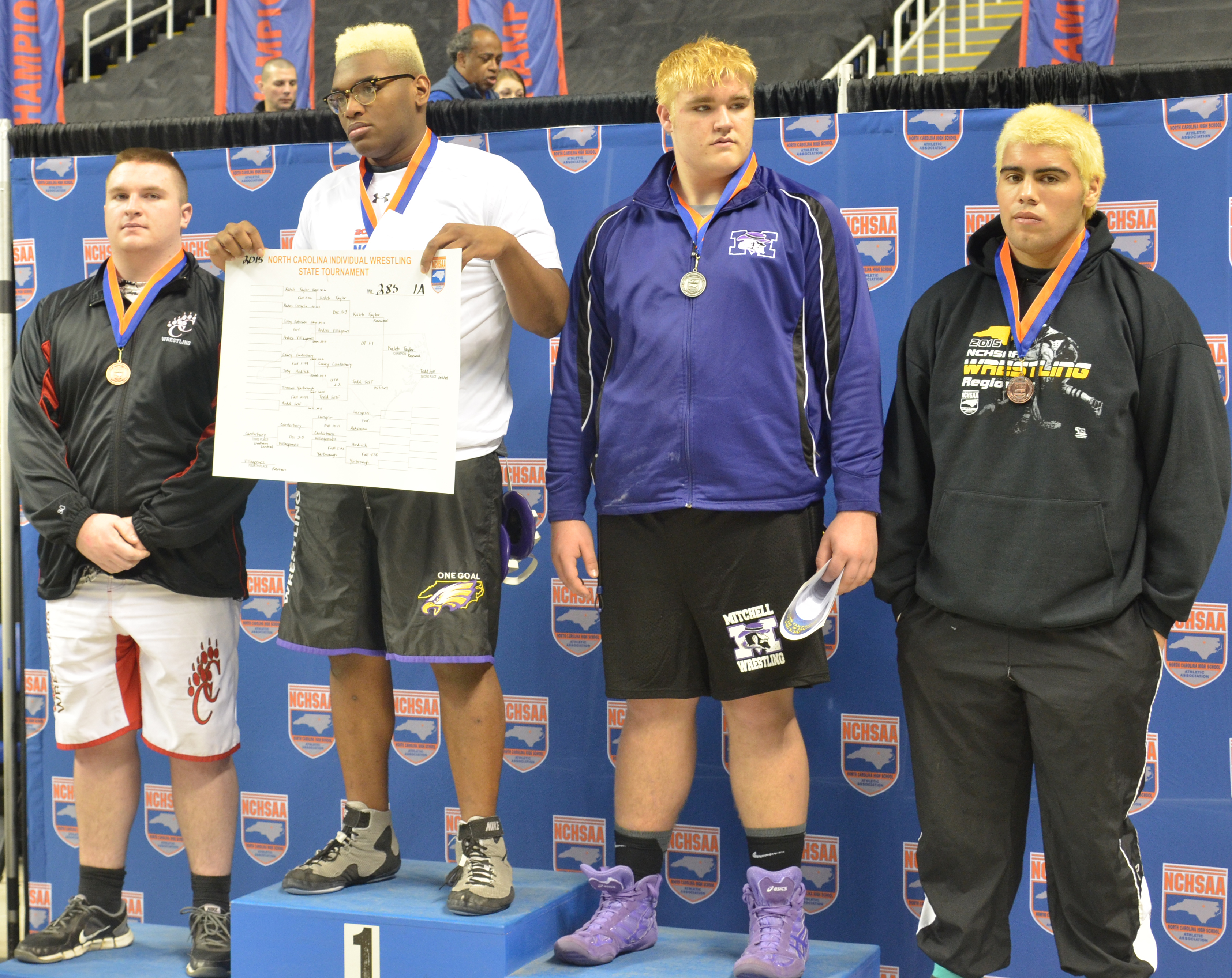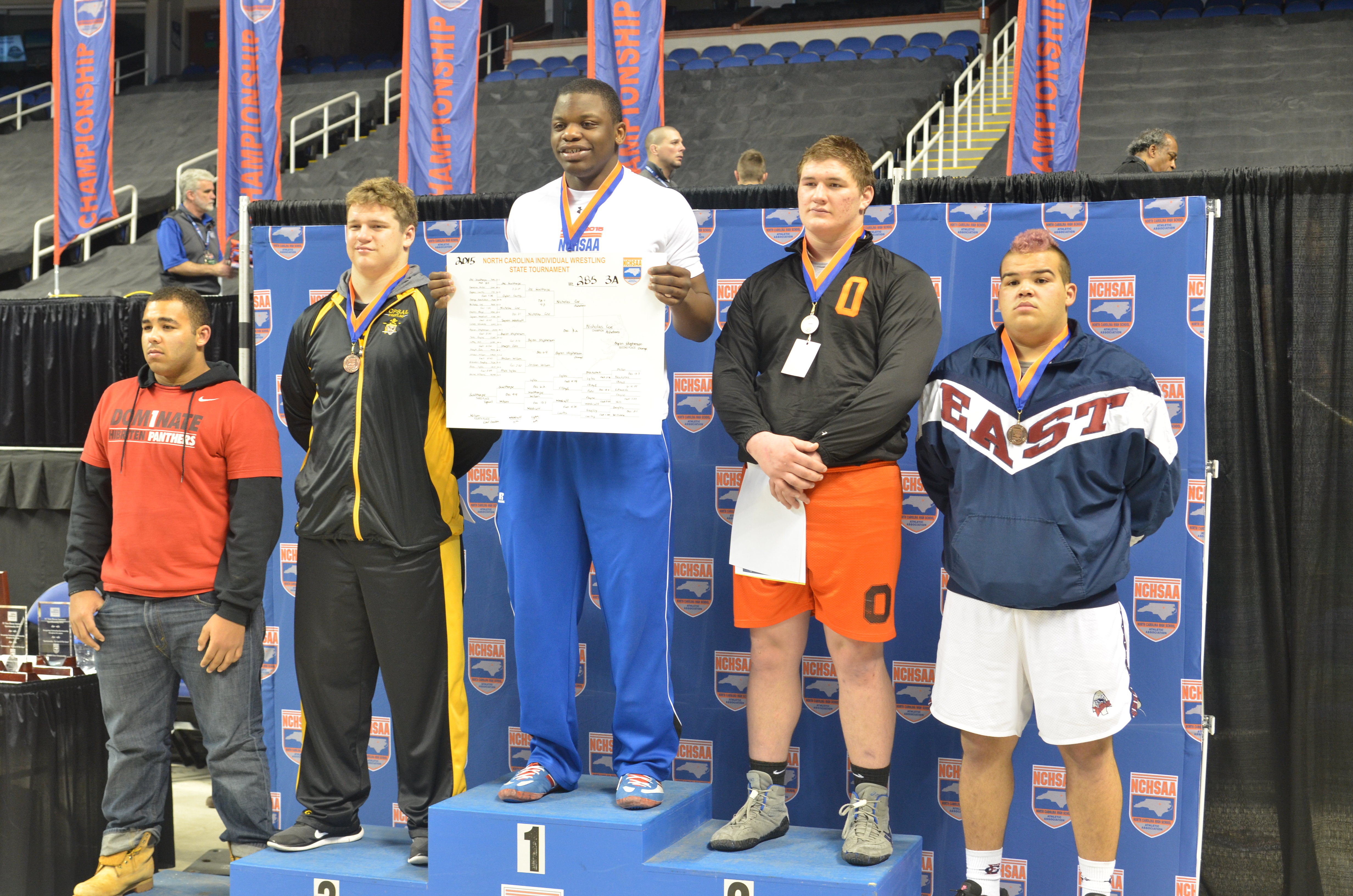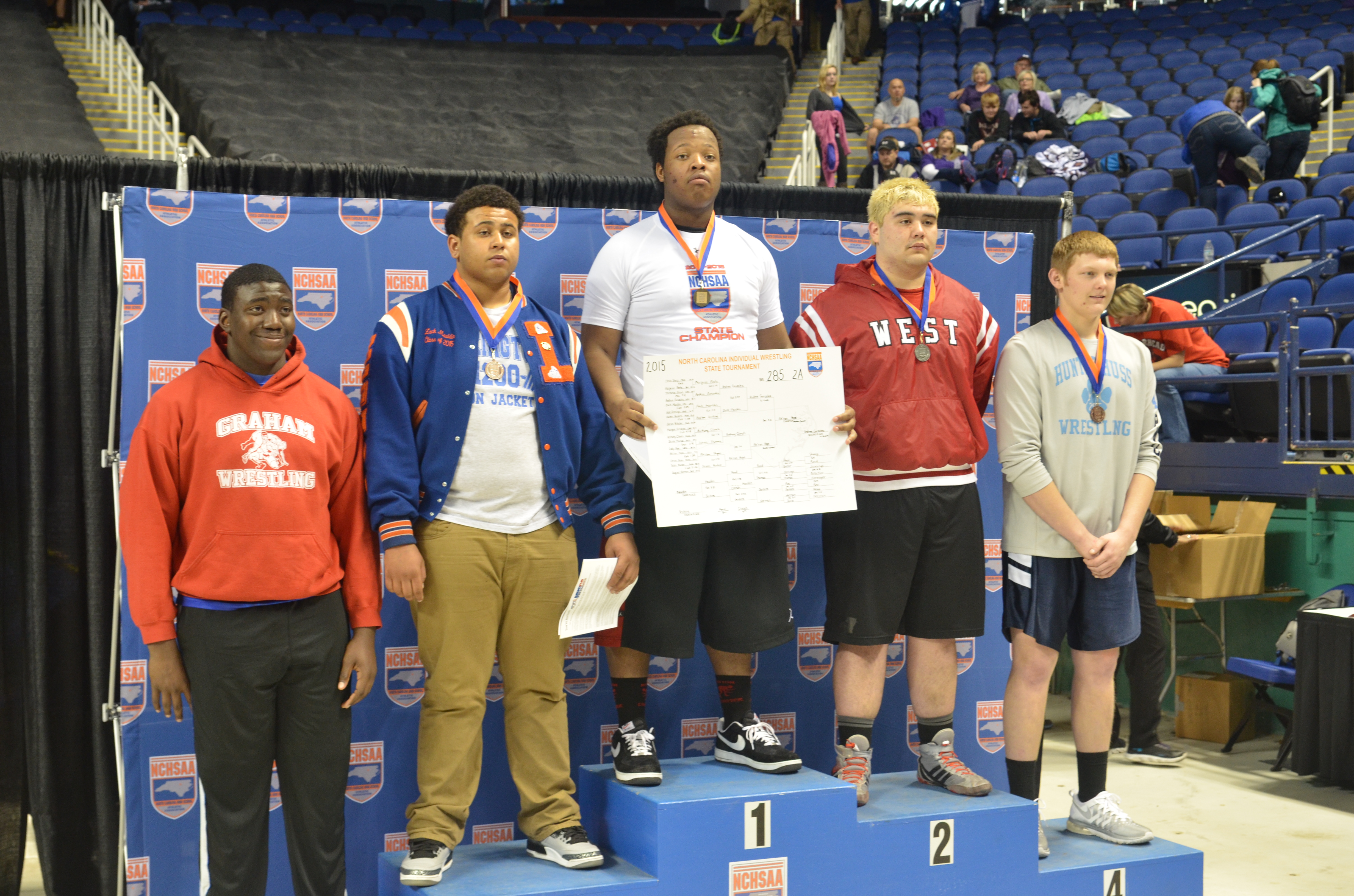 285 Lbs. 3A Champion: Nicholas Coe (Asheboro), 2nd, Byron Stephenson (Orange), 3rd, Joe Sculthorpe (Topsail), 4th, Jordan Wilson (East Gaston) 5th, Tayvon Woodruff (Hibriten), 6th, Alex Lyles (Jesse Carson)