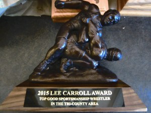 TDR Editor’s Notes ; Undefeated state champion Blaine Mainz of Jacksonville High School has been announced as the 2017 Lee Carroll Award winner. Mainz was named the best senior lightweight wrestler in eastern North Carolina. The details have yet to be determined and announced. The pictures are from 2015 yet are similar to this year’s awards.