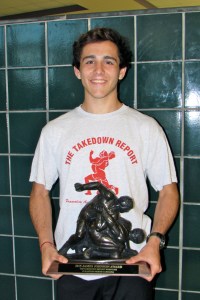 TDR Editor’s Notes ; The photo is of Joe Mondragon of Wilmington Ashley with the 2015 James Johnson Award Trophy he earned as the best senior scholastic wrestler in eastern North Carolina two seasons ago. This year for the first time in 16 seasons two award trophies will be presented as there is a tie for the best senior scholastic wrestler in eastern North Carolina. Undefeated state champion Will Newbern will be presented the award on Monday the 22nd at West Carteret High School. The other undefeated state champion Carlos Martinez of First Flight High School will be presented his award at a time and place to be determined.