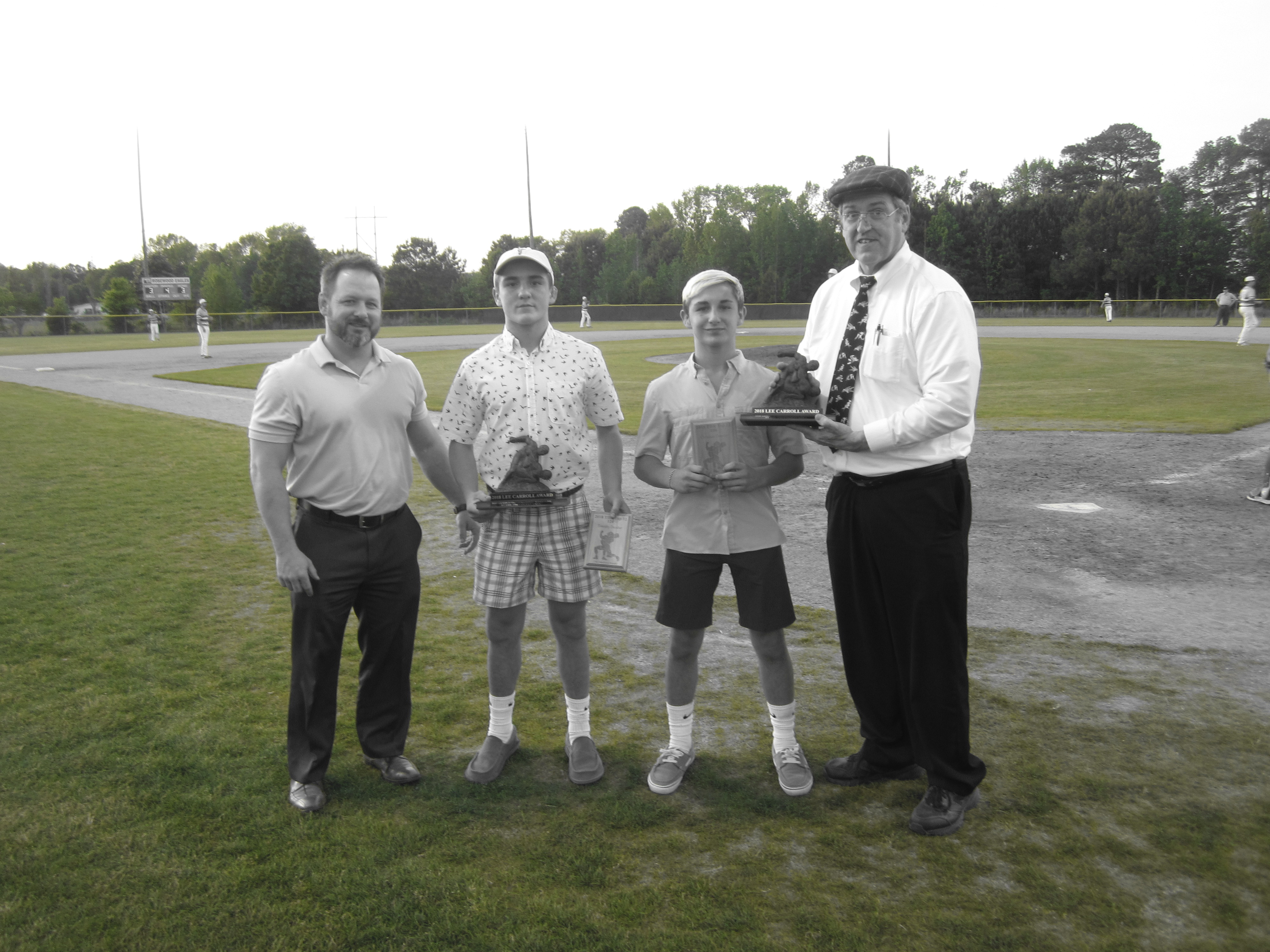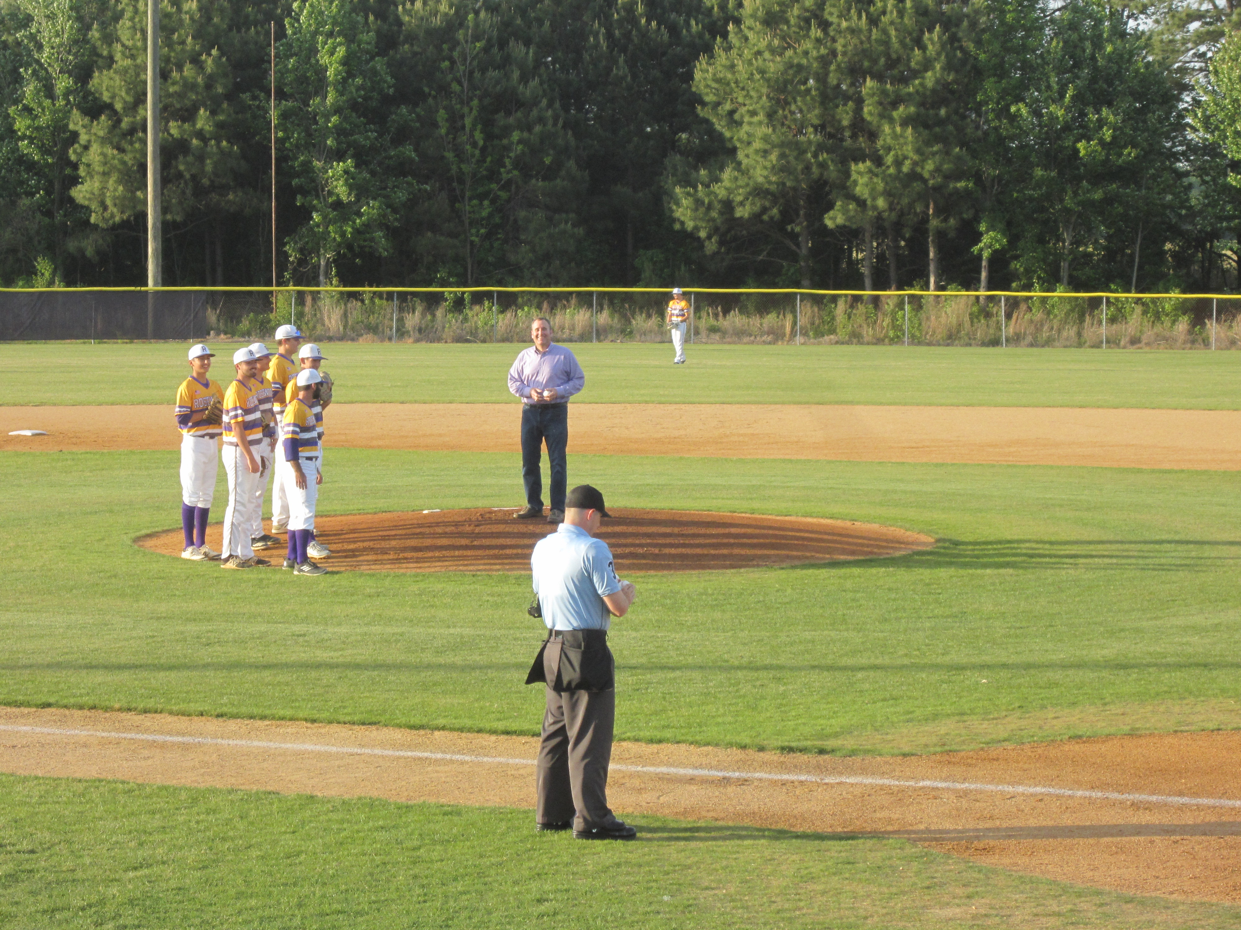 TDR Editor’s Notes ; There have been some difficulties drafting articles and press releases and while that is being worked out we wanted to get these pictures out. The top picture has Lee Carroll (with the beard) with the awards given to Christian and Timothy Decatur-Luker. The one in black & white includes TDR Editor Fleming (in the hat) and the bottom one has Rosewood Coach Bill Edmundson throwing out the first pitch at the Seniors Night Baseball Game.