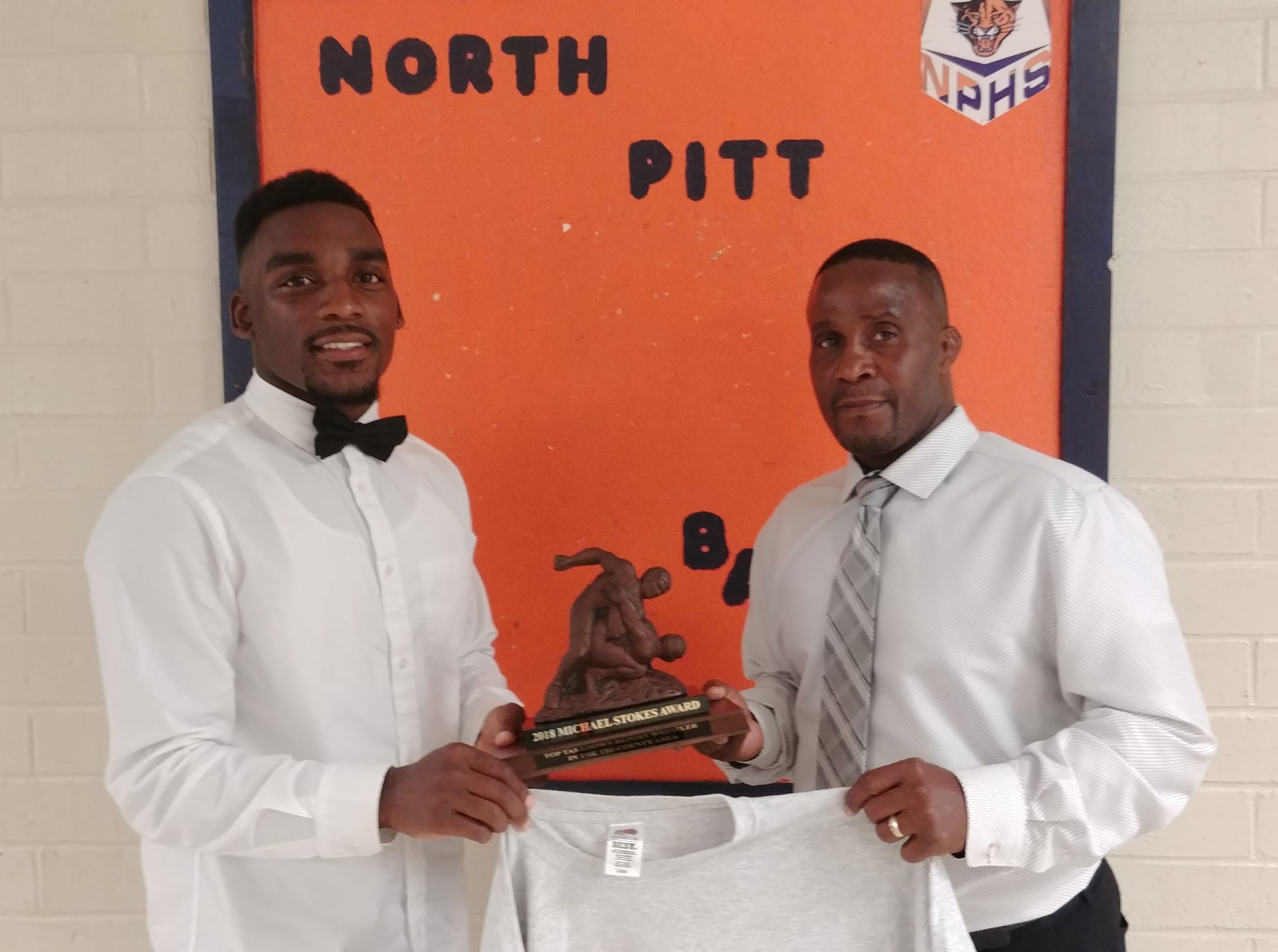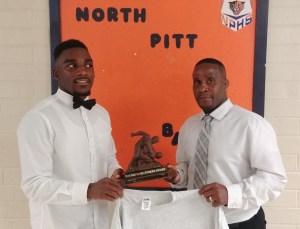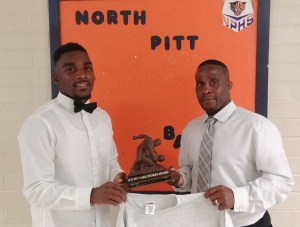 TDR Editor’s Notes; The following are three pictures taken quickly during the Senior Awards Night last week at North Pitt. The 2018 Award goes to Sincere King on the left and Michael Stokes on the right. Pick the one that you like best. Sincere may look a bit anxious to get back on into the auditorium as he was about to be called for some other awards. Yes it is tough being a popular guy. We wish him the best of success for next year. Now the camera man who took these pictures must be replaced as he left out the short that King and Stokes are holding below the trophy but one can only see the top edge of it. We must get someone better to take our pictures.