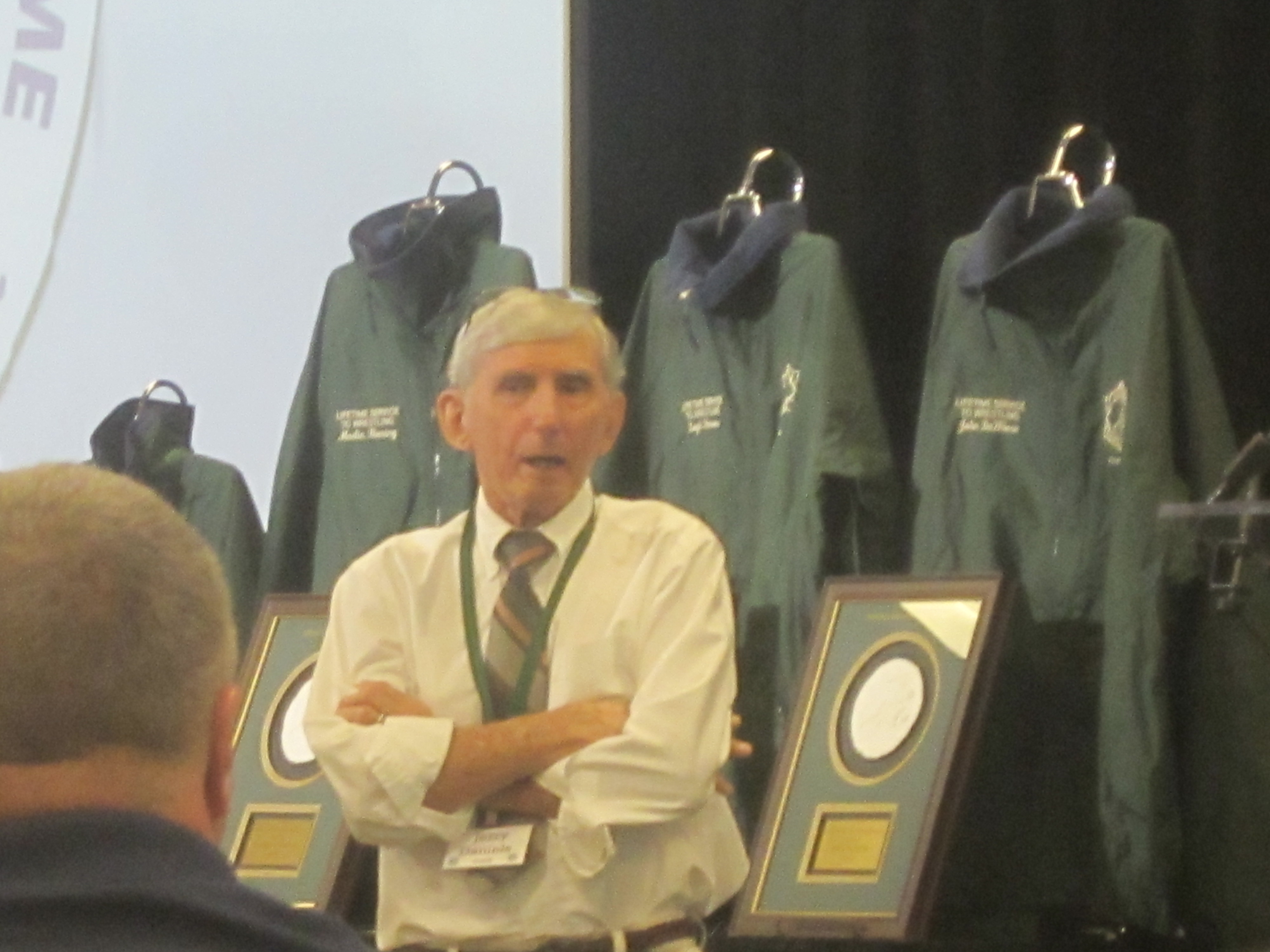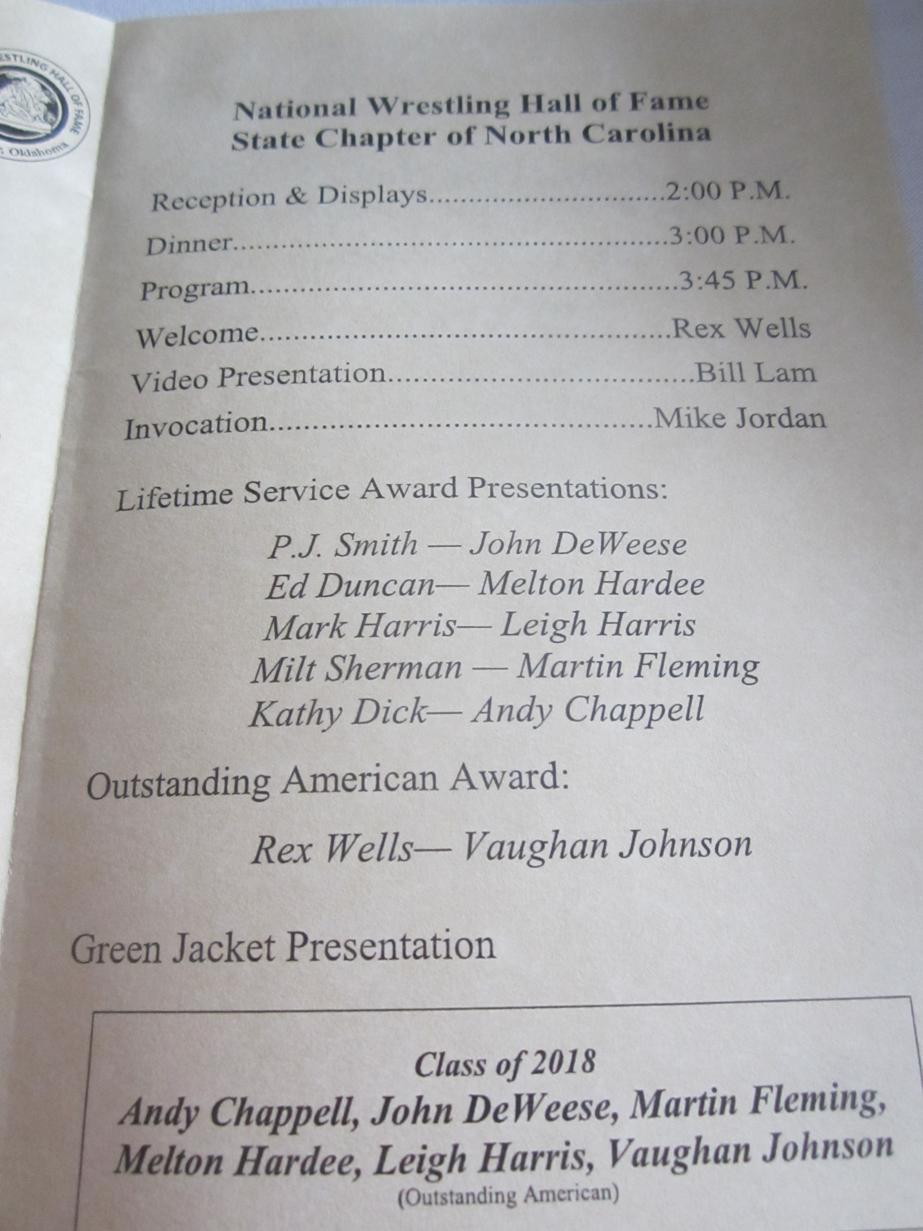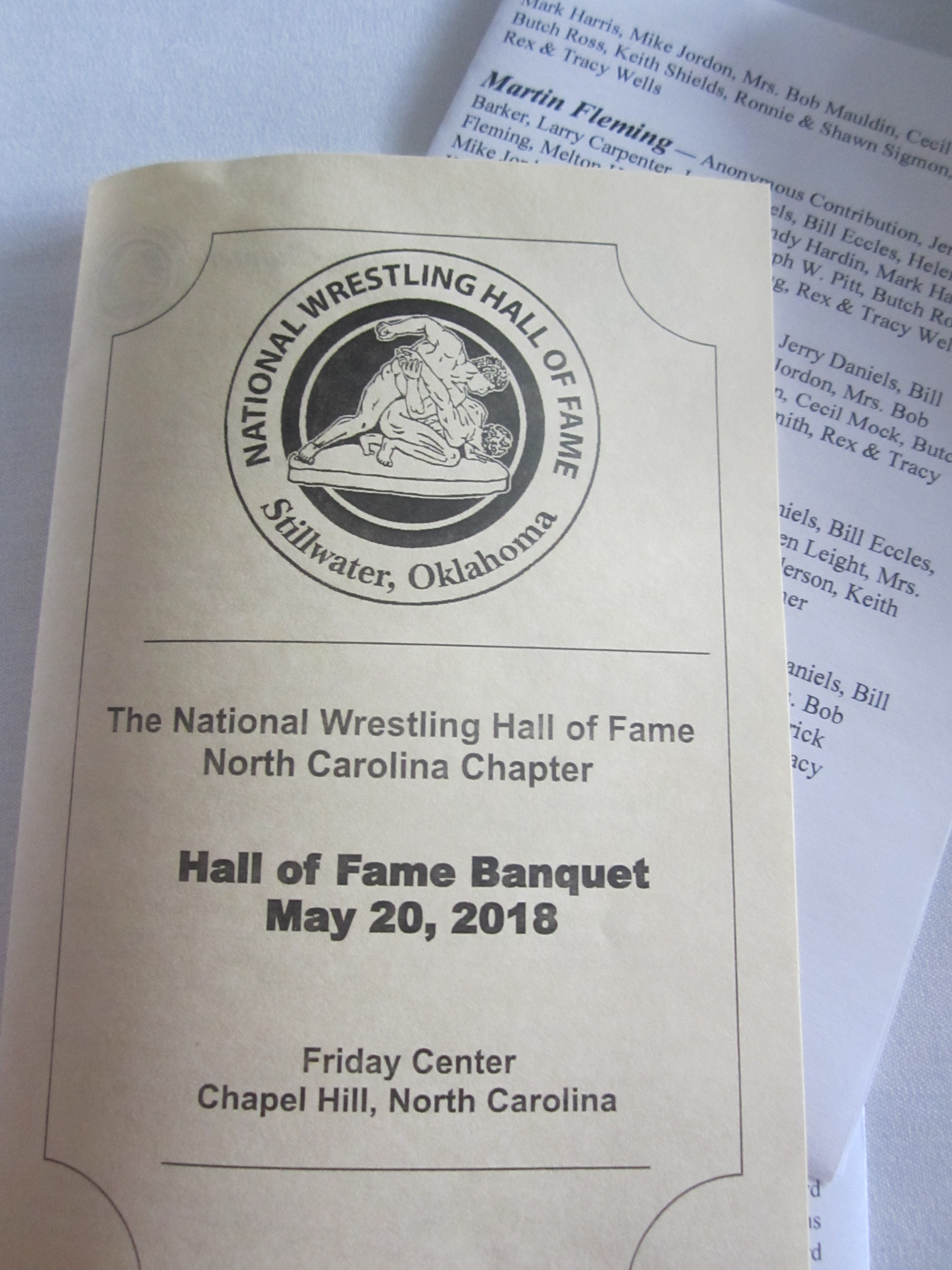 Editor’s Notes; It has been pointed out that we have not shared any of the many photos taken at the North Carolina Induction Banquet for the National Wrestling Hall of Fame. Well, here are some for you to view. The first is of long time Hall of Fame coach Milt Sherman as he introduces one of the Inductees. The second is Jerry Daniels, also known affectionately as ‘Mouse’ along with a list of other previous inductees. The next two are of the cover and inside of the printed program. Next is former long time UNC coach Bill Lam who has been a great worker for the WHOF efforts in North Carolina. Next two pictures are of the new Inductees and the last two are of one of the Inductees speaking and then with chapter president Coach Rex Wells and Milt Sherman.