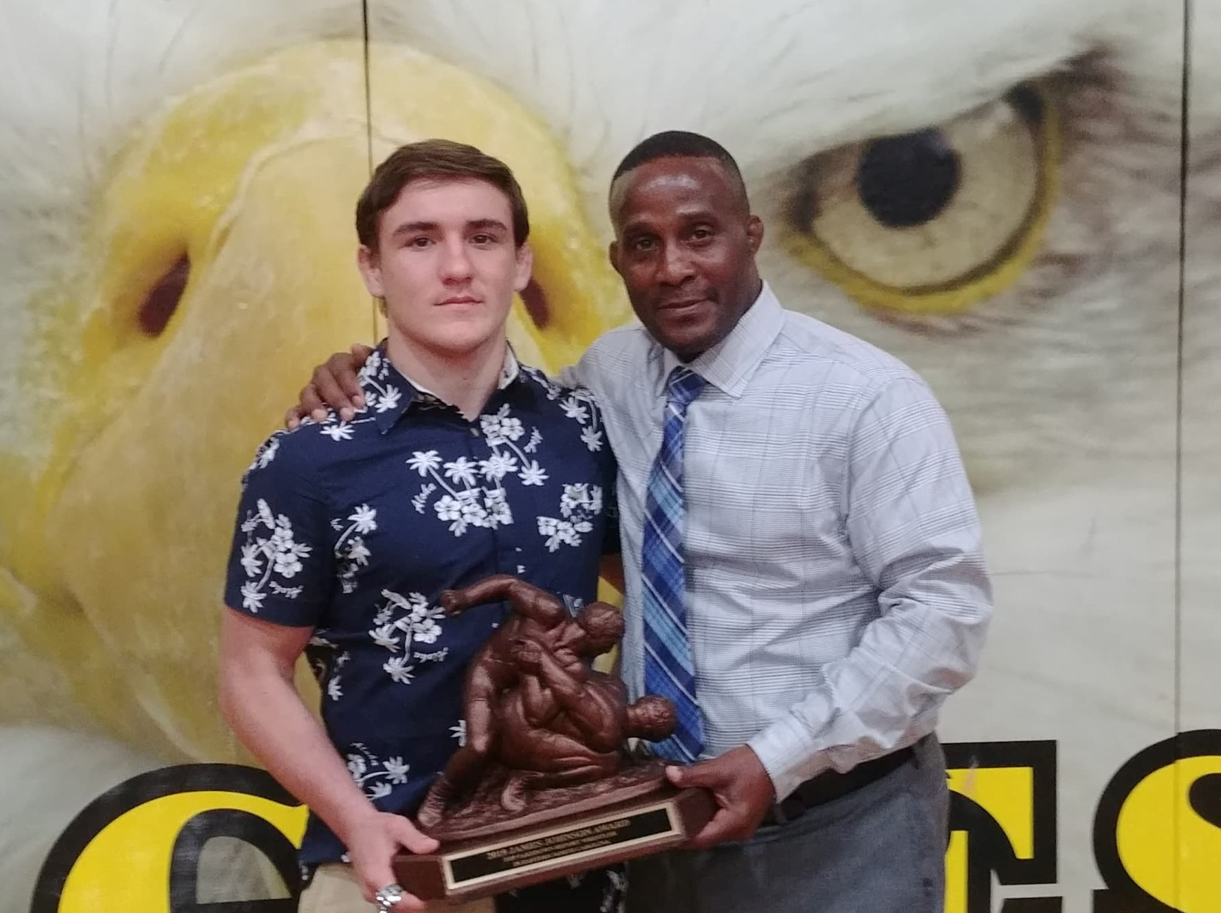 State Champion Timothy Decatur was presented the 21st Annual James Johnson Award trophy as the top senior scholastic wrestler in eastern North Carolina in 2019 at the Athletic Awards Day at Rosewood High School earlier this week. The award is named in honor of three time Greco-Roman national champion James Johnson. Decatur is a 4 time State Medal winner, and he holds the school record for career wins and the most wins by a wrestler in North Carolina since the annual match limit has been in effect. Most impressively he is a three time state champion and four time regional champion.