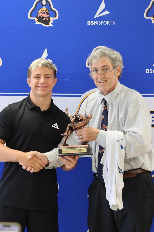 State Champion Alex Hopper with the Roy Heverly Award presented from The TakeDown Report.Undefeated Senior State Champions Devon Bell (182) and Mark Samuel (126) with their James Johnson Awards as the most Outstanding Seniors in eastern North Carolina.