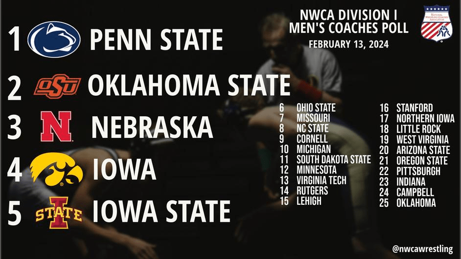 Manheim, Pennsylvania – With a pair of ranked wins, including a 29-6 win over then-No. 3 Iowa, top-ranked Penn State pushed its win streak to 53 duals in a row and another week as the unanimous No. 1 in most recent NWCA Division I Men’s Wrestling Coaches Poll released on Tuesday.