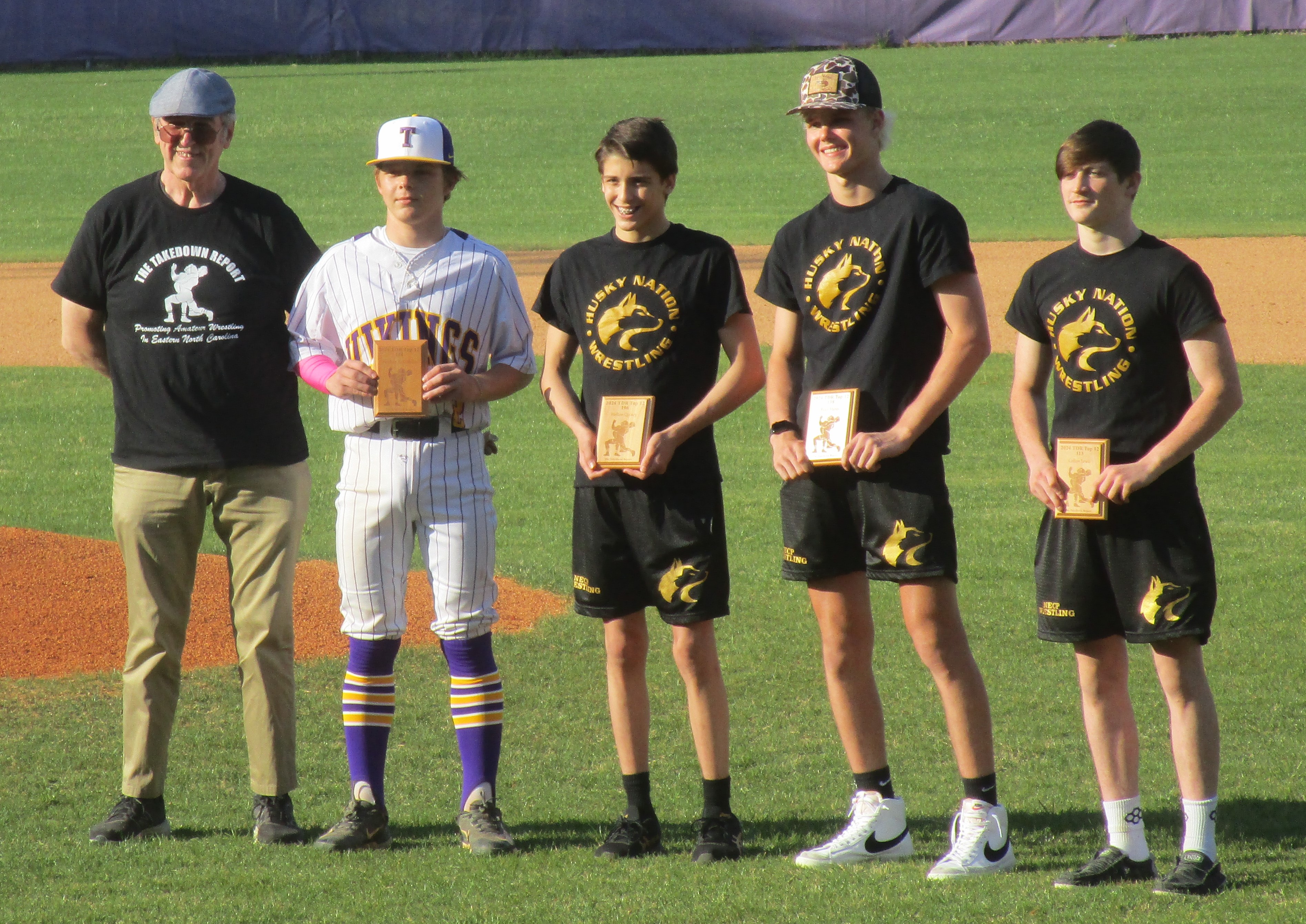 On Tuesday April 16th, before the Tarboro baseball game with North East Carolina Prep, The TakeDown Report presented the TDR Top 12 team plaques to four outstanding wrestlers in the town of Tarboro. TDR Editor Martin Fleming presented the award plaques to State Champion Ryan Mann, State Champion Holton Quincy, State Placer Colton Lewis and State Placer Stephen Rubistello (who is also a pretty good baseball player).