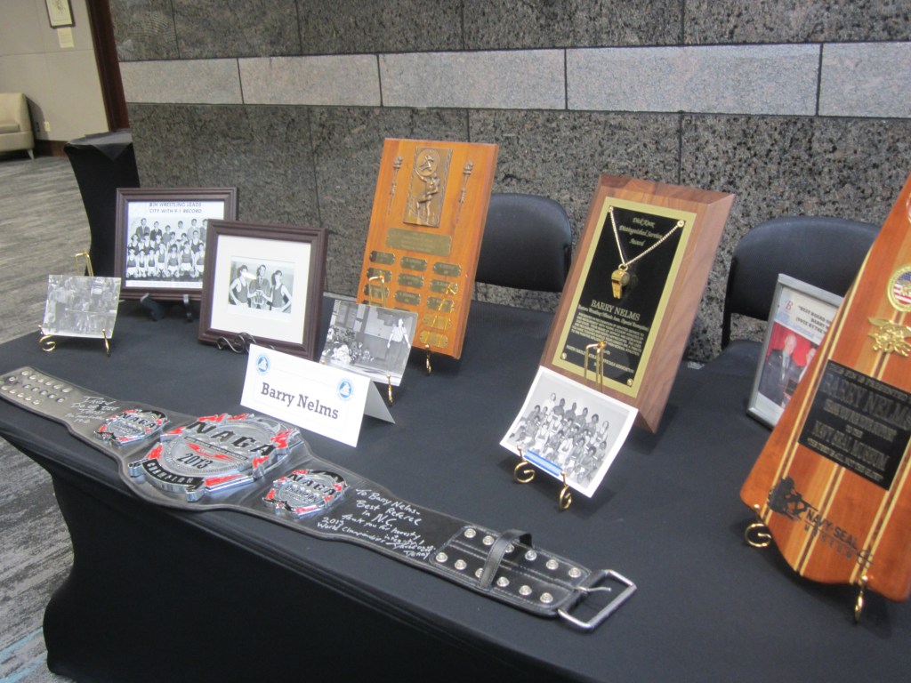 Barry Nelms – Born in Newport News, Virginia, Nelms was introduced to wrestling as a high school junior at Princess Anne High School in Virginia Beach. After graduating in 1960, Nelms served in the United States Navy until 1968 and was a combat veteran. As a plane captain in an anti-submarine warfare squadron, Nelms saw action in Guantanamo Bay in 1962 during the Cuban Missile Crisis. Nelms earned an undergraduate degree in Education and a graduate degree in Marine Biology from the Norfolk College of William and Mary (today Old Dominion) in Norfolk. While in college, Nelms remained active as a wrestler and was an intramural champion at 189 lbs.