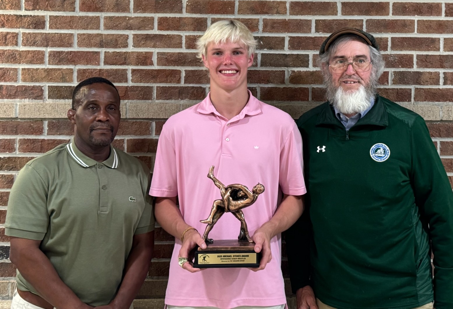 State champion Ryan Mann of North East Carolina Prep School was presented with the 2025 Michael Stokes Award. Michael Stokes and TDR Editor Martin Fleming made the presentation to Ryan with his teammates and the school’s award assembly in the Fleming building at Edgecombe Community College during school Award Night.