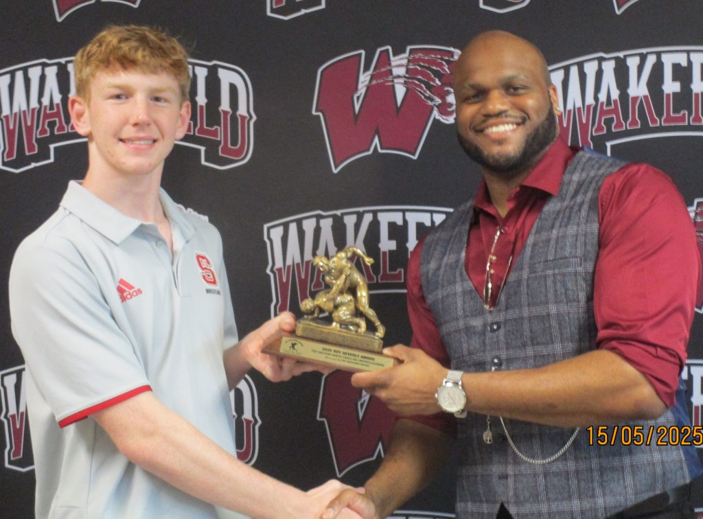 State champion Tobin McNair of Wakefield H.S. was presented the Heverly Award, as the top underclassman scholastic wrestler in eastern North Carolina this year. He completed his sophomore season undefeated with 40 wins. His career record so far is (94 – 2) with a 3rd place finish at the state tournament his freshman year. Both losses were to eventual state champions. He has also won two Regional Championships.